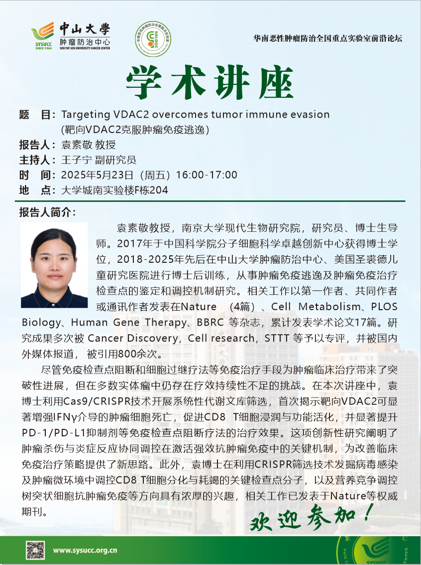 袁素敬教授-Targeting VDAC2 overcomes tumor immune evasion (靶向VDAC2克服肿瘤免疫逃逸)-学术讲座