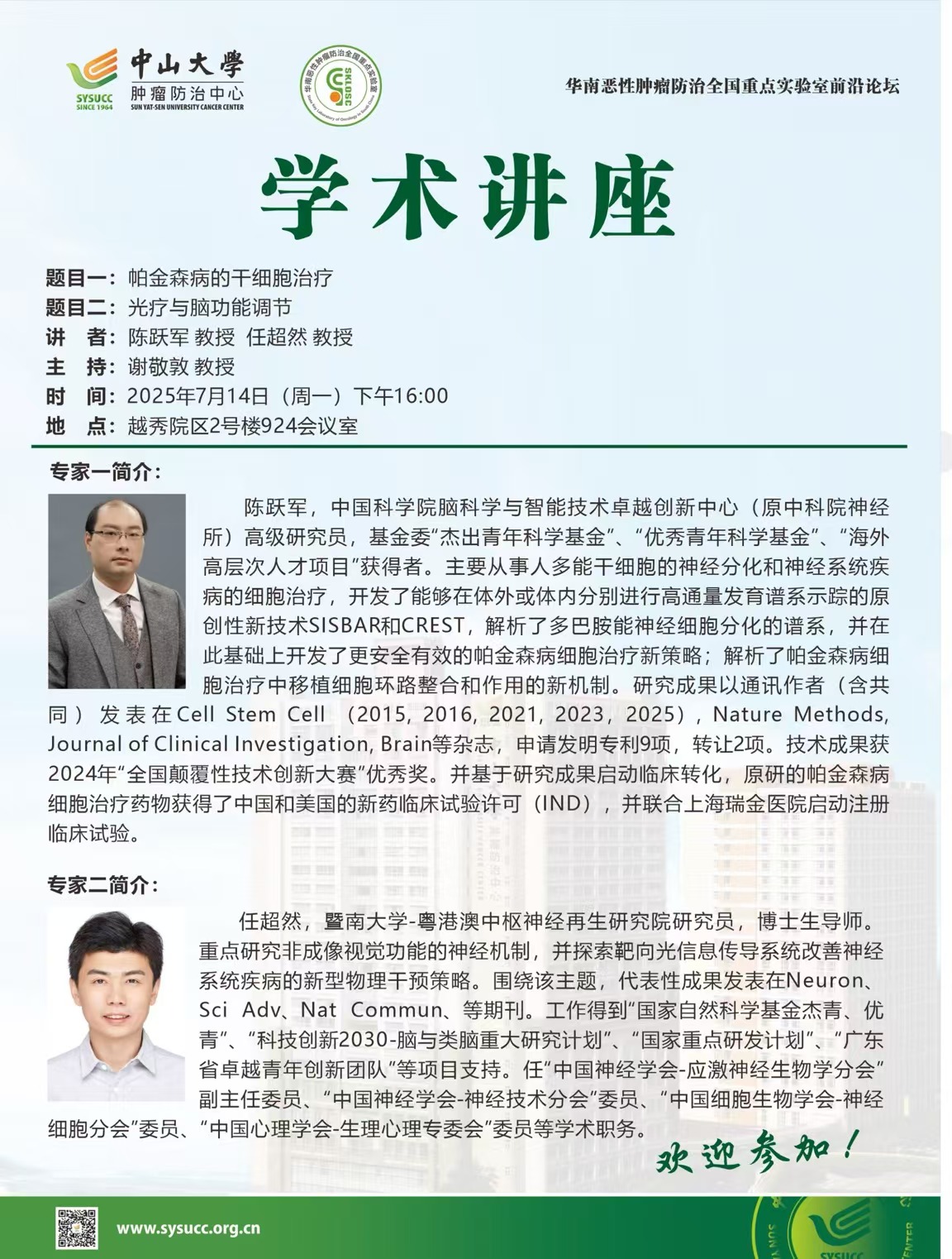 陈跃军教授、任超然教授-帕金森病的干细胞治疗、光疗与脑功能调节-学术讲座