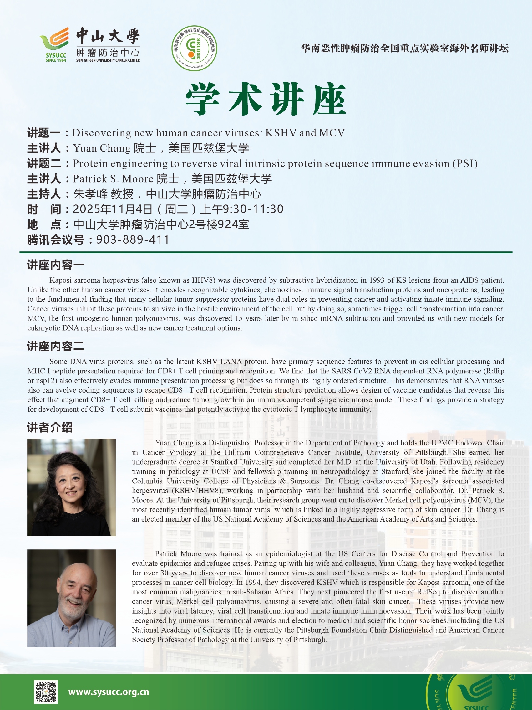 Yuan Chang 院士、PatrickS.Moore 院士-Discovering new human cancer viruses: KSHV and MCV & Protein engineering to reverse viral intrinsic protein sequence immune evasion (PSI)-海外名师论坛