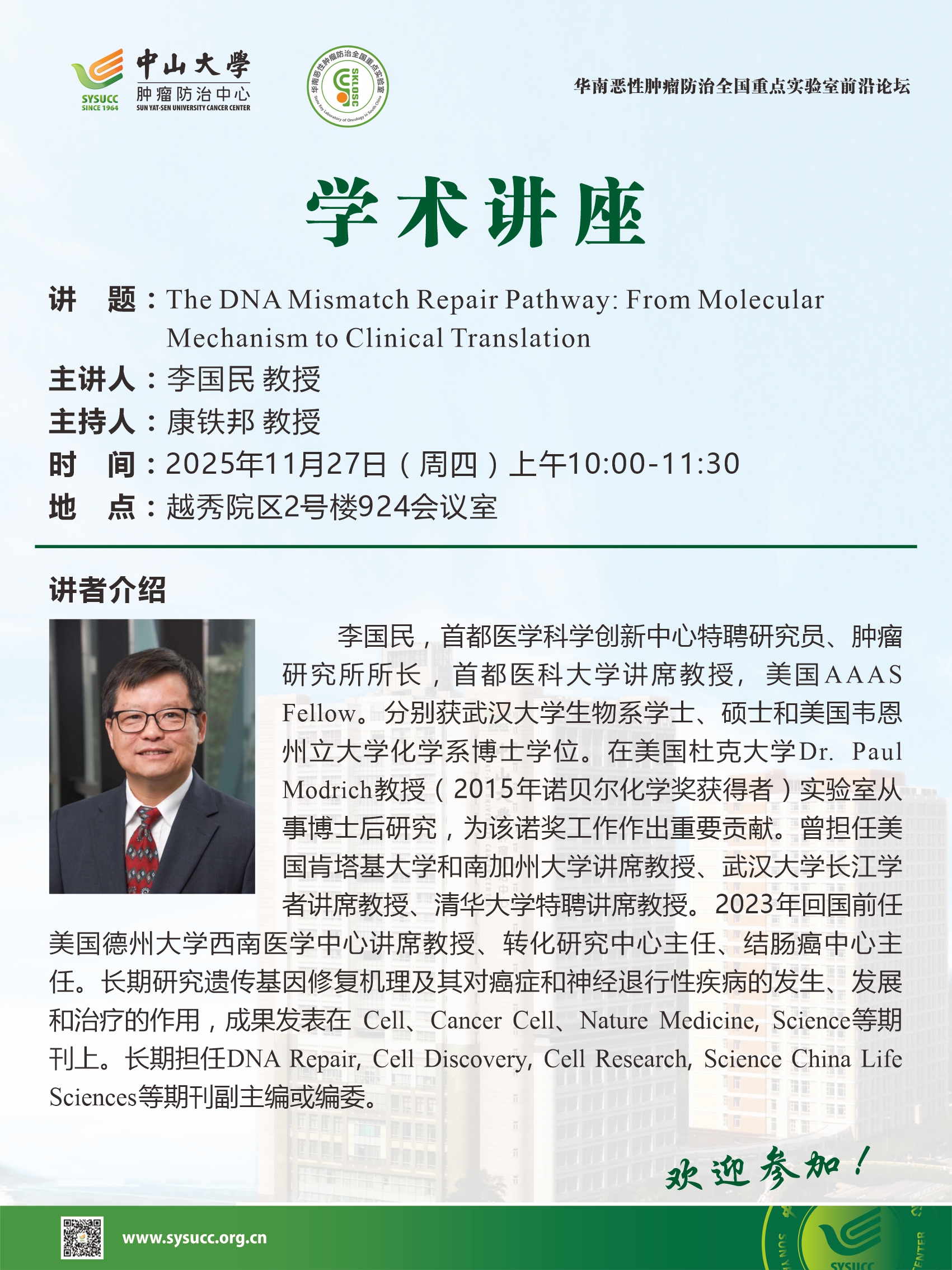 李国民教授-The DNA Mismatch Repair Pathway: From MolecularMechanism to Clinical Translation-学术讲座