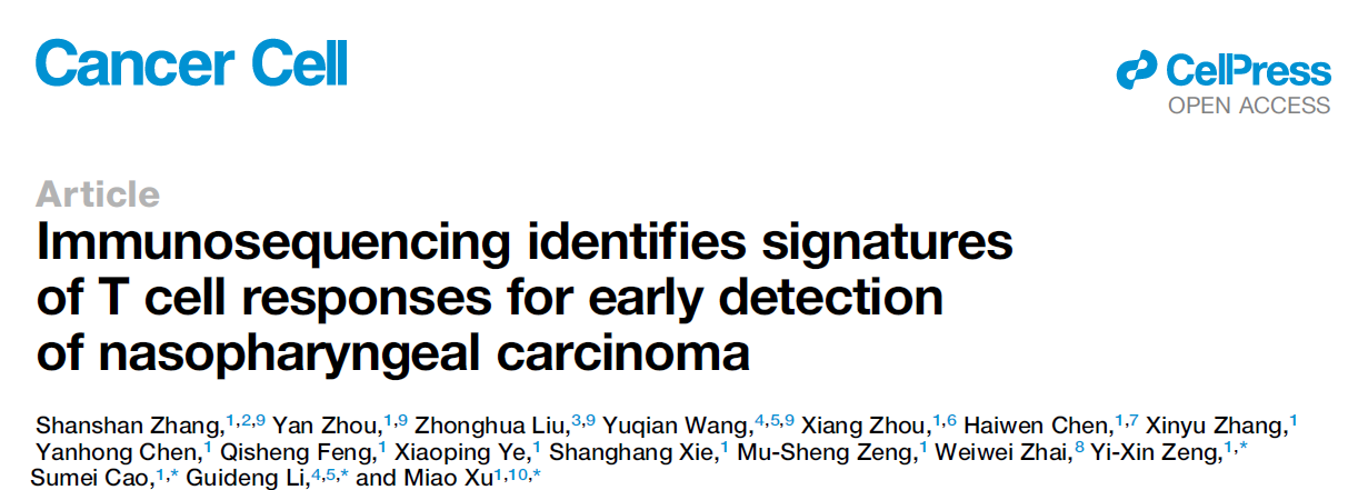 近日,中山大学肿瘤防治中心徐淼研究员联合中国医学科学院苏州系统医学研究所李贵登研究员、中山大学肿瘤防治中心曹素梅研究员团队,在Cancer Cell期刊在线发表题为“免疫测序鉴定鼻咽癌早期检测的T细胞反应的特征”的研究论文(点击阅读原文查看)。该研究首次通过大规模T细胞受体(TCR)免疫组库测序,锁定鼻咽癌特异性T细胞克隆,构建可提前6-12个月预警鼻咽癌发生的T-score模型,并揭示EB病毒(EBV)与肿瘤抗原双重识别的免疫监视机制,为鼻咽癌早诊与细胞治疗提供全新策略。