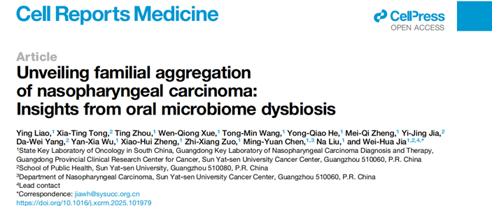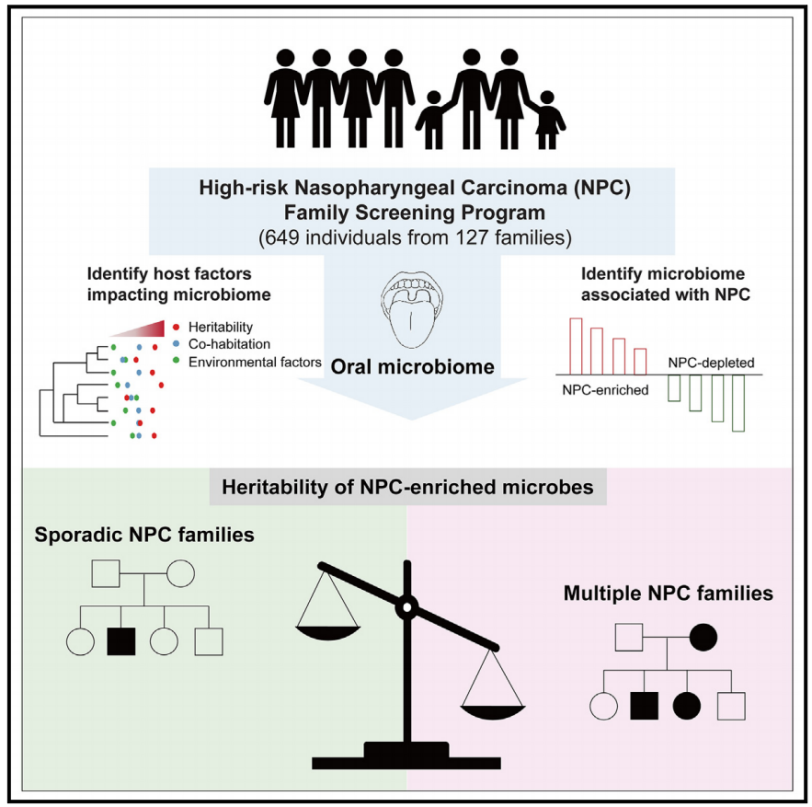 近日,中山大学肿瘤防治中心/华南恶性肿瘤防治全国重点实验室贾卫华教授团队在《细胞报告医学》(Cell Reports Medicine)发表题为“Unveiling familial aggregation of nasopharyngeal carcinoma: Insights from oral microbiome dysbiosis”的研究工作(点击阅读原文查看)。这项基于鼻咽癌高癌家系的大规模微生物组学研究,首次揭示了遗传因素对口腔菌群失衡的显著影响,为鼻咽癌的家族性风险预警和精准预防提供了全新方向。