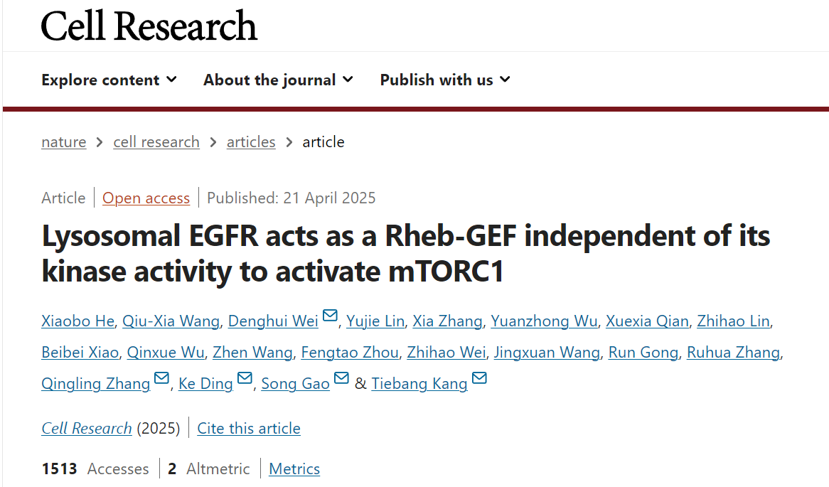 4月21日,中山大学肿瘤防治中心(华南恶性肿瘤防治全国重点实验室)康铁邦、高嵩、魏灯辉团队联合中科院上海有机化学研究所丁克以及广东省人民医院张庆玲研究团队在国际顶级期刊《细胞研究》(Cell Research)在线发表最新成果:《溶酶体上的EGFR以激酶非依赖机制作为Rheb的GEF直接激活mTORC1》(点击阅读原文查看)。该发现揭示了激活型EGFR持续内吞现象的功能意义,为肿瘤治疗策略的创新提供了新的理论依据。