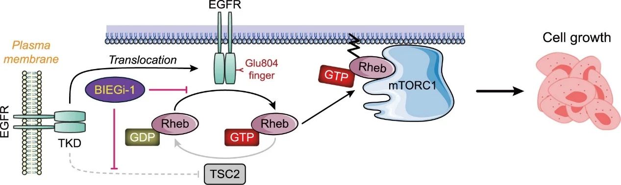 进一步深入机制研究发现,激活型EGFR在内吞至溶酶体后,可作为小GTP酶Rheb的鸟苷酸交换因子(GEF),以非激酶依赖的方式直接激活mTORC1,从而促进肿瘤细胞的持续增殖与生长。该发现揭示了激活型EGFR持续内吞现象的功能意义,即通过稳定激活mTORC1以维持肿瘤细胞的旺盛增殖状态,为肿瘤治疗策略的创新提供了新的理论依据。