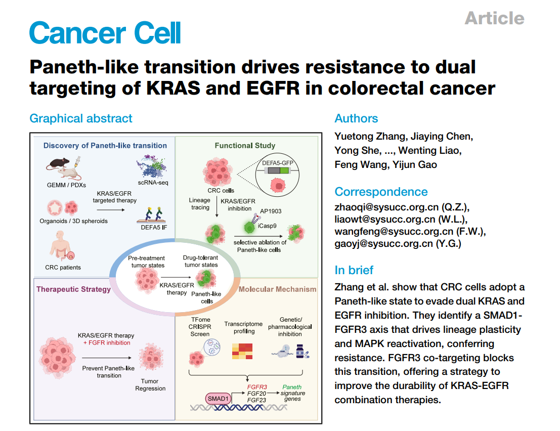 2025年11月13日,华南恶性肿瘤防治全国重点实验室高益军、王峰、廖雯婷与赵齐团队合作,在Cancer Cell发表题为“类潘氏细胞转分化驱动结直肠癌对KRAS/EGFR双靶治疗耐药”的研究论文(点击阅读原文查看)。研究发现,结直肠癌细胞在治疗压力下发生向类潘氏细胞(Paneth-like)状态的谱系转变,阐明了转录因子SMAD1通过激活FGFR3信号通路促进类潘氏转分化、驱动治疗耐药的分子机制,为靶向肿瘤谱系可塑性延缓耐药提供了全新思路。