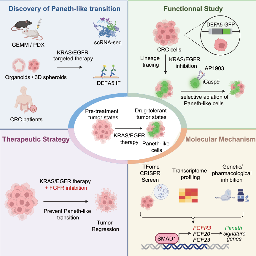 本研究揭示了结直肠癌细胞谱系可塑性在KRAS/EGFR靶向治疗耐药中的核心作用,阐明了转录因子SMAD1通过激活FGFR3信号通路诱导肠癌细胞向类潘氏状态转分化,从而驱动双靶治疗耐药的分子机制。本研究深化了对肿瘤细胞命运重塑与治疗耐受关系的理解,并提出联合抑制FGFR3作为延缓耐药的新策略,为克服KRAS突变型结直肠癌中可塑性驱动的治疗耐受指明了新方向。