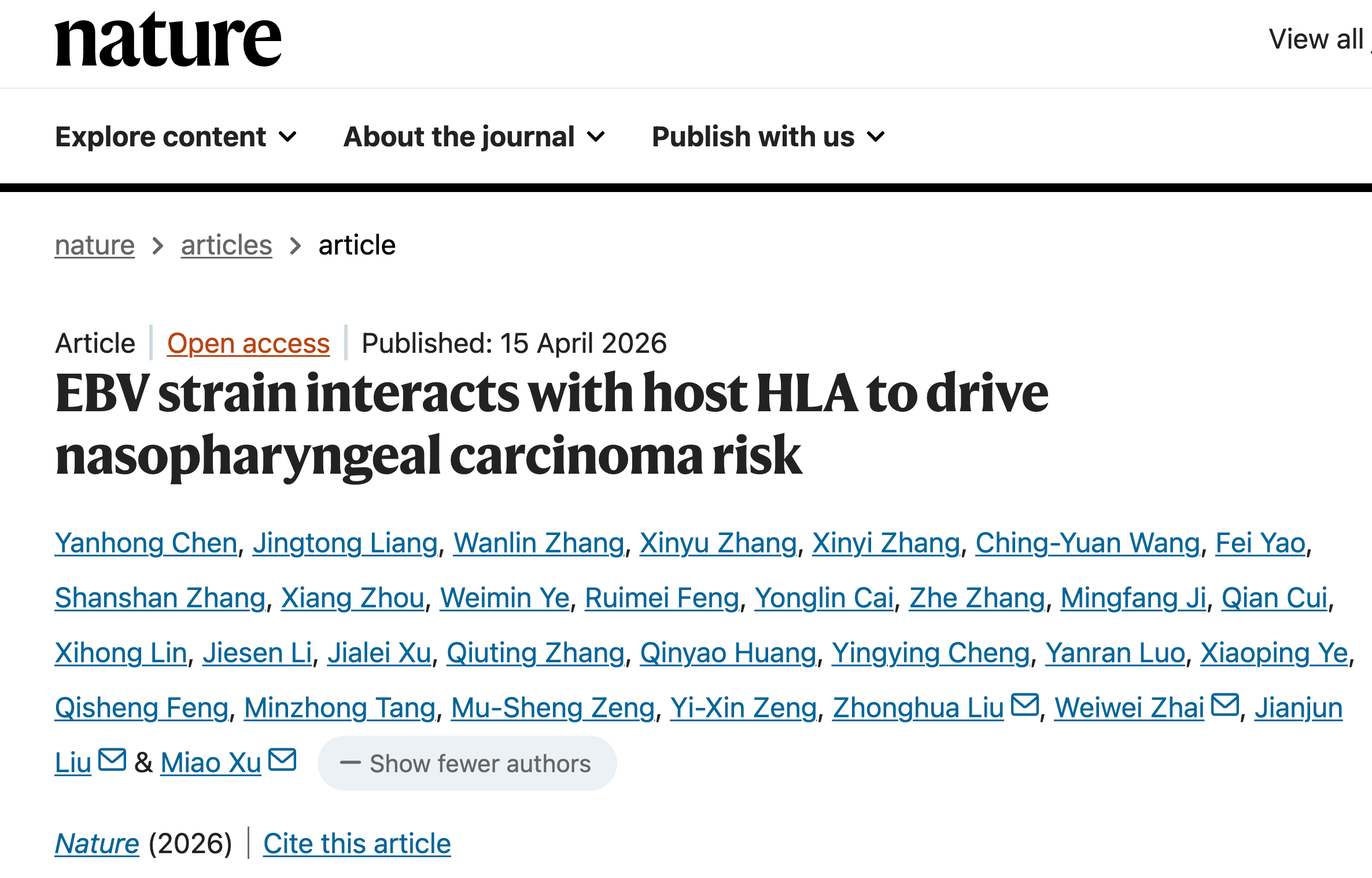 4月15日,华南恶性肿瘤防治全国重点实验室徐淼教授团队,联合新加坡基因组研究所刘建军教授、中科院动物研究所翟巍巍教授、哥伦比亚大学刘中华教授在国际顶级期刊《自然》(Nature)上发表了题为《EBV毒株与宿主HLA互作驱动鼻咽癌发病风险》的研究成果(点击阅读原文查看)。该研究首次揭示,鼻咽癌的高发并非由高危EB病毒或宿主遗传背景单一因素决定,而是两者“里应外合”协同作用的结果——特定宿主基因型与高危EB病毒亚型互作,使发病风险飙升17倍,从病毒-宿主互作的全新角度,解开了华南地区鼻咽癌高发的“地域魔咒”。