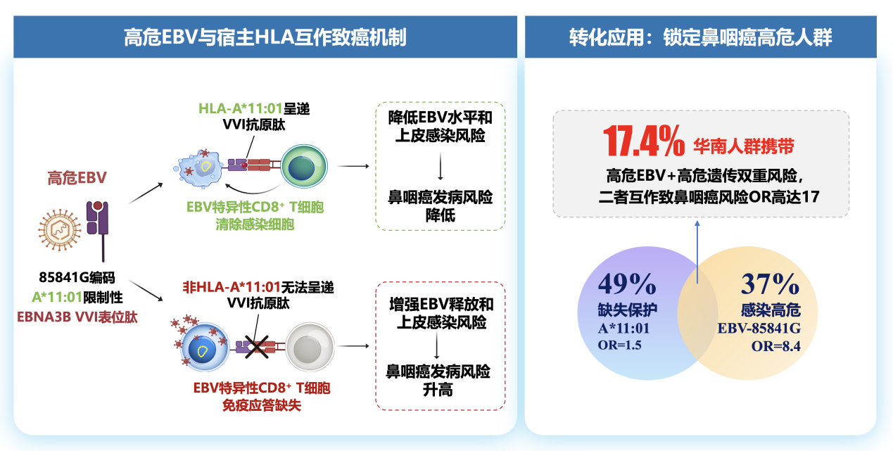 研究发现,鼻咽癌发病风险由HLA-A等位基因和高危EB病毒的85841位点A>G 变异互作共同决定,并非由宿主或病毒亚型单一因素决定。在功能层面,该高危EB病毒变异通过改变EBNA3B抗原表位(VVI表位第9位氨基酸Q>R),决定其能否被HLA-A*11:01有效呈递,并直接影响CD8 T细胞对高危EB病毒感染细胞的识别和杀伤效率。