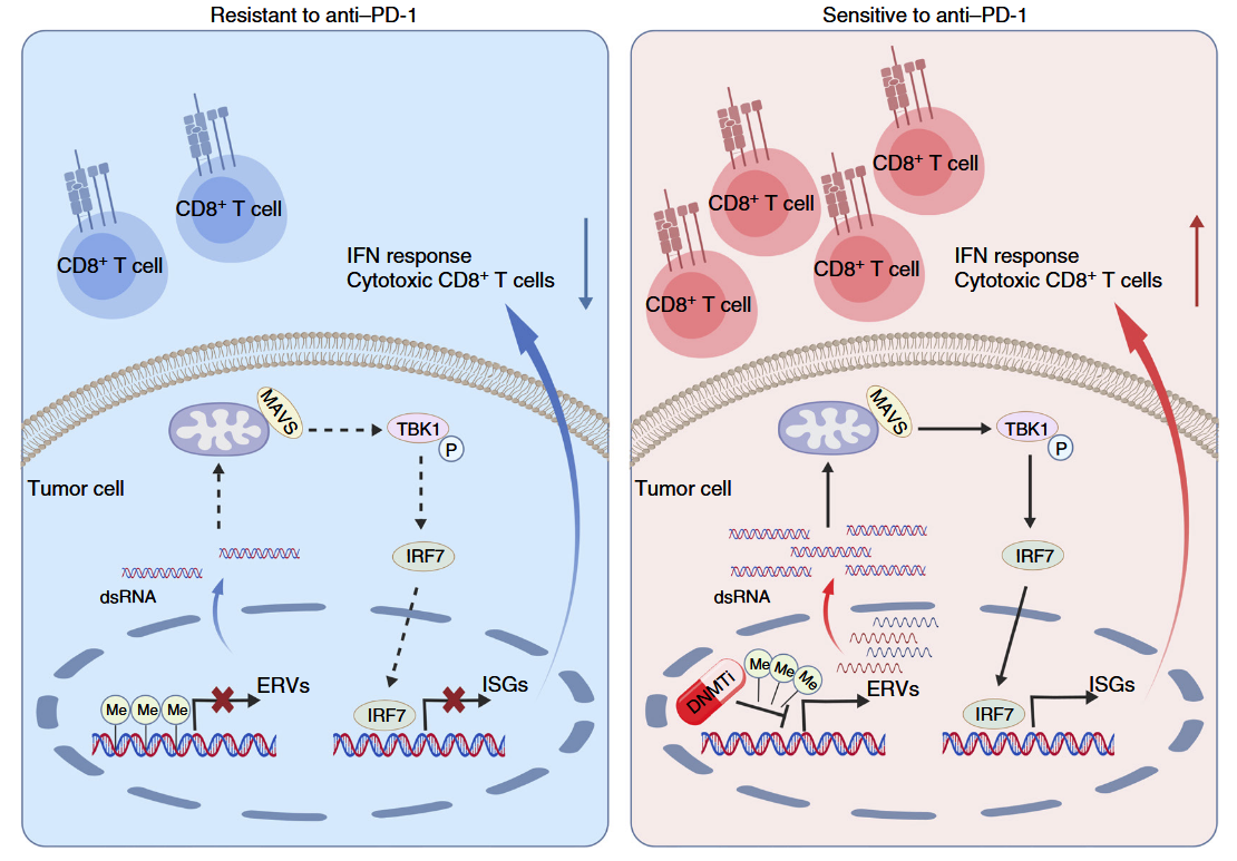 更为重要的是,研究人员进一步构建了PD-1单抗获得性耐药的小鼠T细胞淋巴瘤荷瘤模型,通过流式细胞分析和转录组测序发现耐药肿瘤的干扰素信号通路显著下调,肿瘤微环境中活化CD8+T细胞的浸润显著减少,表现为免疫排斥型的“冷”肿瘤特征,对PD-1单抗治疗无响应。而联合DNMT抑制剂能够克服小鼠模型对PD-1单抗的耐药,显著增加活化CD8+T细胞的浸润,实现从“冷”肿瘤向“热”肿瘤的转化。此外,通过肿瘤细胞-CD8+ T细胞体外共培养实验,研究者进一步证实DNMT抑制剂能够增强T细胞对肿瘤细胞的激活和杀伤效应。进一步通过转录组测序、转座子分析和双链RNA抗体染色/流式分析等实验,研究人员发现DNMT抑制剂通过上调肿瘤细胞中反转录病毒序列的表达,引起双链RNA在胞内堆积,诱发病毒模拟效应进而激活干扰素信号通路。而使用干扰素抑制剂能够在体内外模型中消除DNMT抑制剂诱导的抗肿瘤免疫效应,证实DNMT抑制剂通过上调反转录病毒序列的表达激活干扰素信号通路(病毒模拟效应),进而增强T细胞的浸润和杀伤功能。