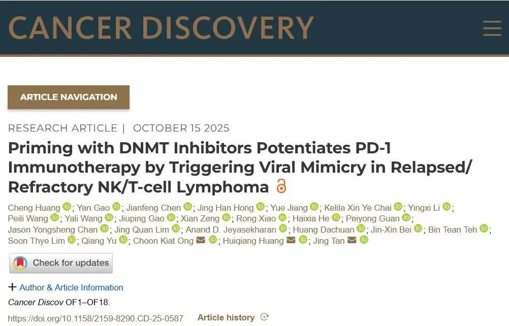 近日,中山大学肿瘤防治中心谭静联合黄慧强团队在Cancer Discovery发表了题为“DNMT抑制剂通过触发病毒拟态反应增强PD-1免疫疗法治疗难治复发型NK/T细胞淋巴瘤的疗效”的文章(点击阅读原文查看)。该研究证明了在前线免疫治疗失败的难治复发的NKTL患者中应用DNMT抑制剂联合信迪利单抗(抗PD-1单抗)方案是安全有效的。同时,团队还建立了PD-1单抗获得性耐药的小鼠T细胞淋巴瘤荷瘤模型以及体外肿瘤细胞-CD8+T细胞共培养模型,并发现DNMT抑制剂通过诱导病毒模拟效应增强CD8+T细胞的浸润和杀伤功能能克服NKTL对PD-1单抗的耐药,为联合方案的应用提供了理论依据。
